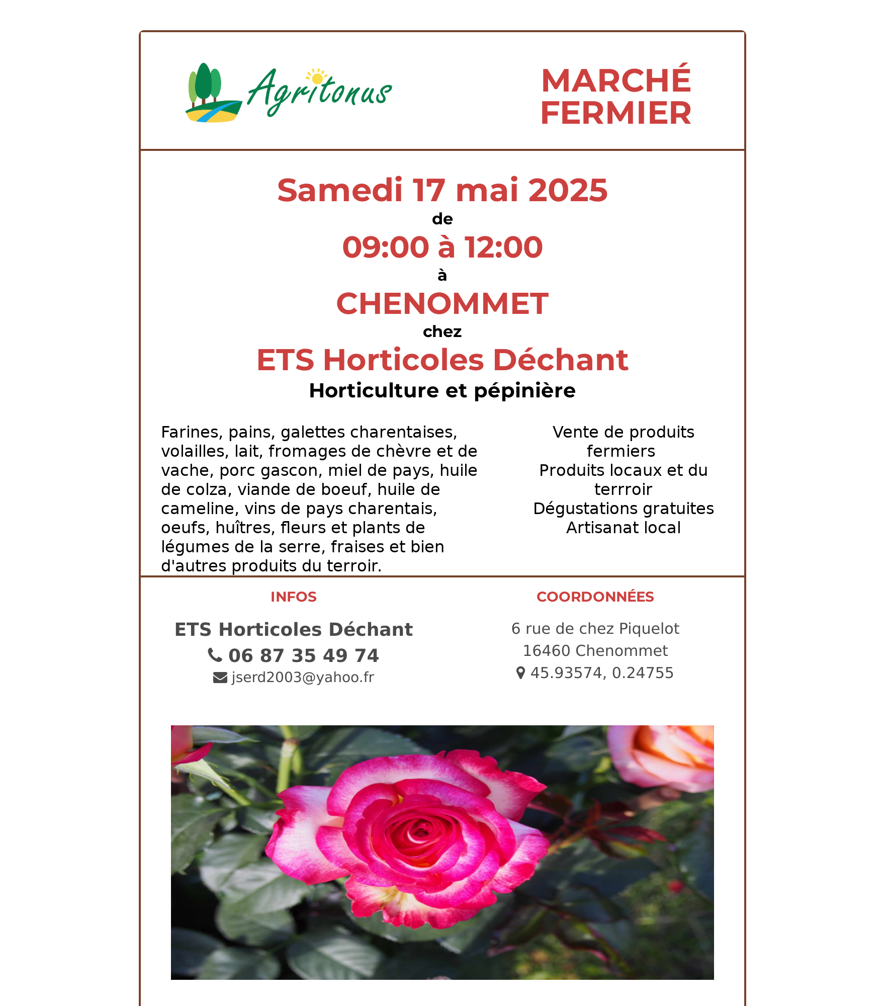Fleurs et plants de légumes de la serre, volailles, lait, fromages de vache et fromages de chèvre, porc gascon, Miel de pays, huile de colza, viande de boeuf, huile de cameline, vins de pays charentais, oeufs, huîtres, farines, pains, galettes charentaises, fraises, et bien d'autres produits du terroir.